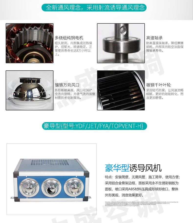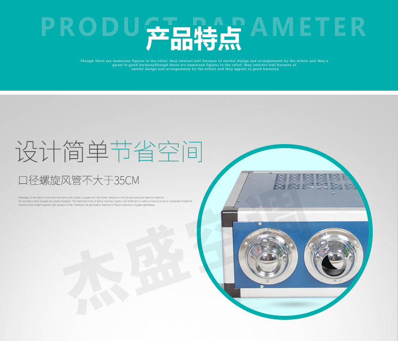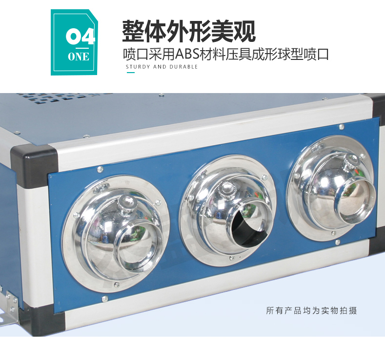 特點:安裝簡便,無需風管,施工簡單,使用方便;采用鋁合金骨架邊框,面板采用永不生銹彩鋼板為面板,噴口采用ABS材料壓具成形球形噴口,整體外形美觀,消音效果更好。