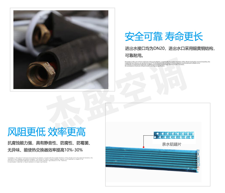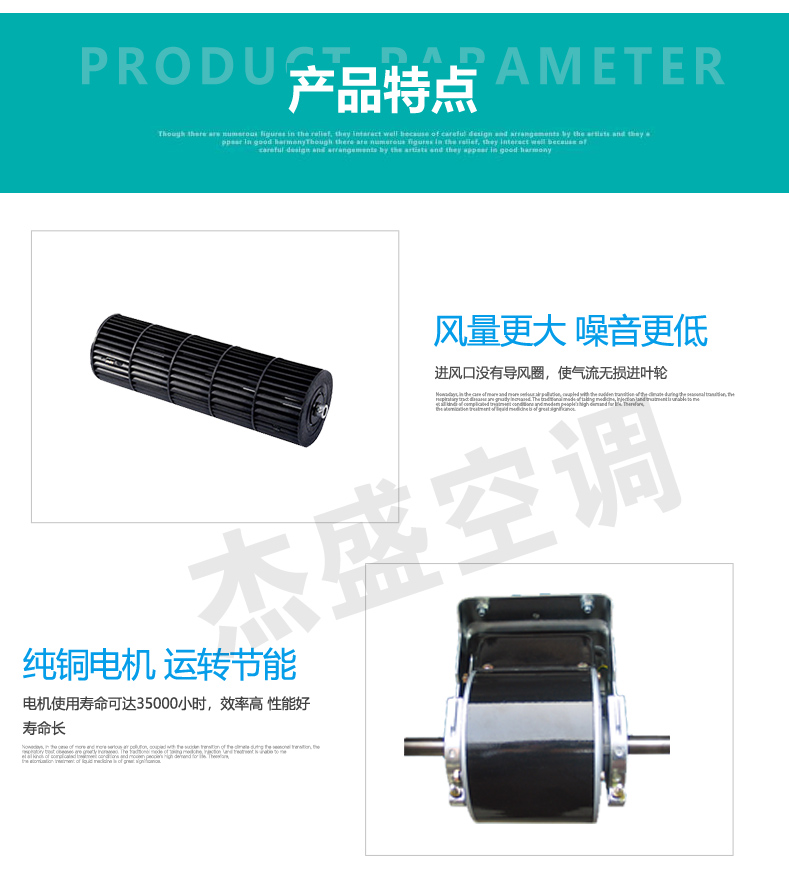 本機組主要特點是結構緊湊、造型新穎、耗電少、噪聲低,安裝維修方便。本產品主要由金屬葉輪的雙進風離心式風機、低噪聲三速空調電機、先進的漲管工藝制造的銅管串鋁片換熱器、整體拉伸的凝水盤和優質材料的殼體組成。