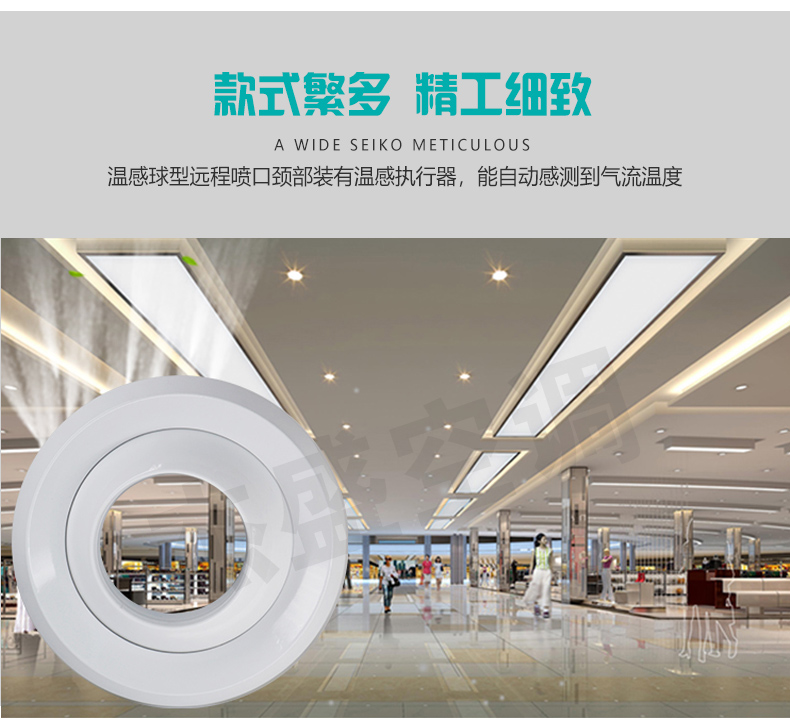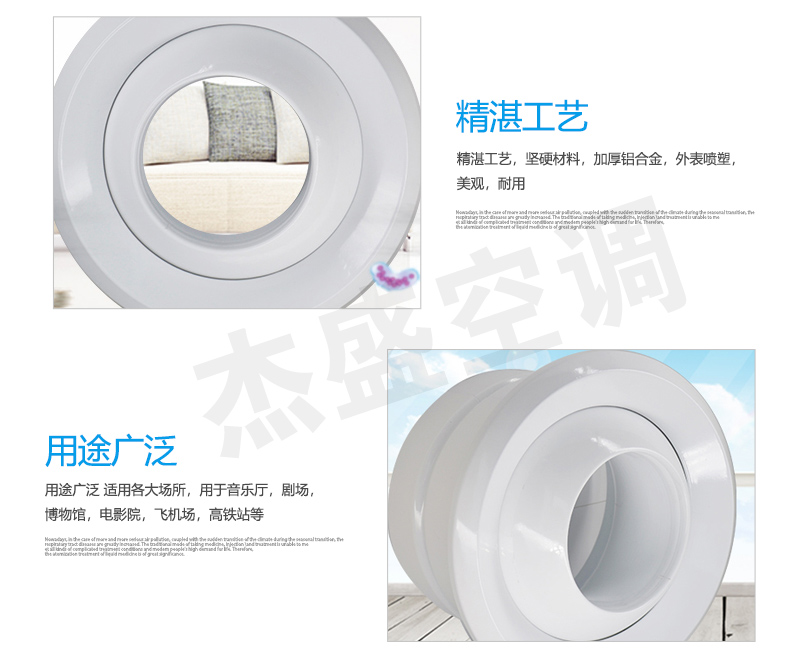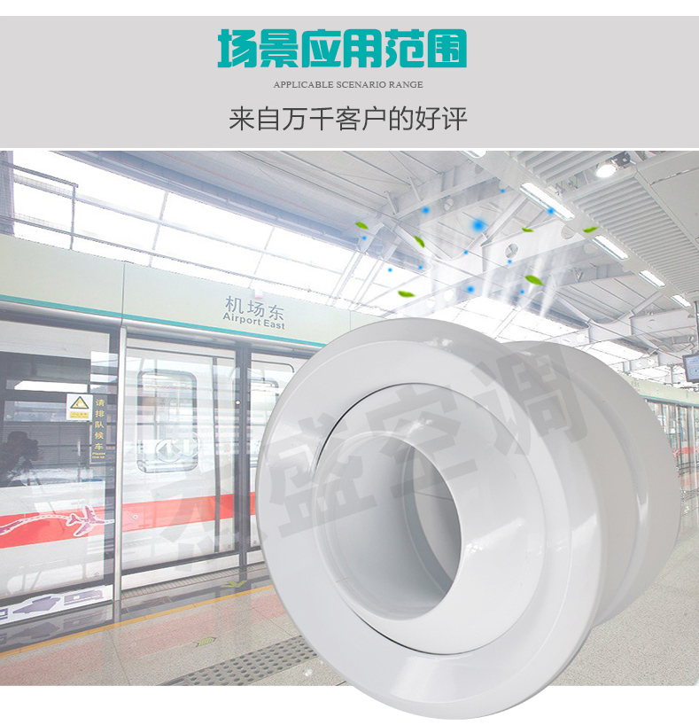 球形噴口可以分為氣動或電動的控制系統。由于采用最佳的空氣動力學噴口結構設計,達到了理想的噪聲的控制,又由于它的高品質的外形設計,可用于音樂廳、劇場、博物館等高級場所